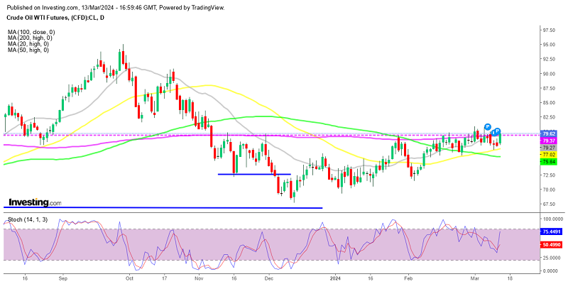 The current outlook for crude Oil is bullish today, but the larger picture looks neutral, influenced by several factors. Such factors include softer US data, failed attempts to clearly break above $80 and hold, ongoing tensions in the Red Sea, and the decision by OPEC+ to extend voluntary output cutbacks into the second quarter without resulting in a significant price increase.