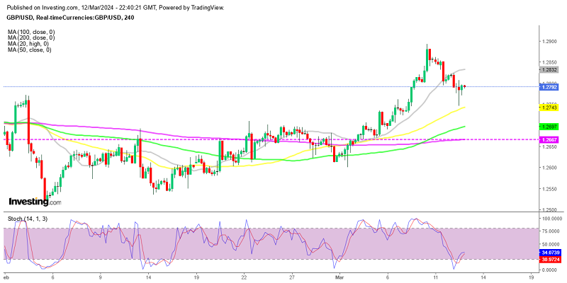 [[GBP/USD]] made a strong bearish reversal this week after a strong rally last week. Yesterday’s softer UK employment report and the stronger US CPI inflation numbers weighed on the GBP, sending the price 150 pips lower, but the decline stalled at 1.2748, as GBP traders were waiting for today’s UK GDP report for January.