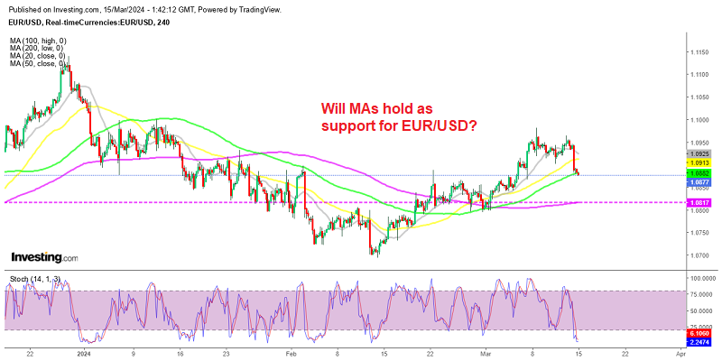 Currently, the EUR/USD pair has retraced around 100 pips from its recent highs and is encountering resistance from moving averages. If these moving averages are breached, it could signal further downside movement. The next significant support levels to watch for are around 1.08, where the 200-period Simple Moving Average (SMA) stands, followed by 1.07 for the EUR/USD pair. These levels could serve as potential targets if the downward momentum continues.