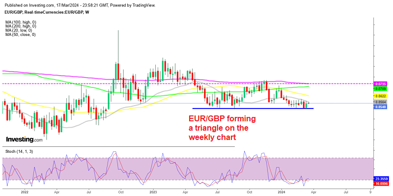 The larger picture of EUR/GBP continues to show a bearish trend, as highs keep getting lower. However, the support zone at 0.85 is holding