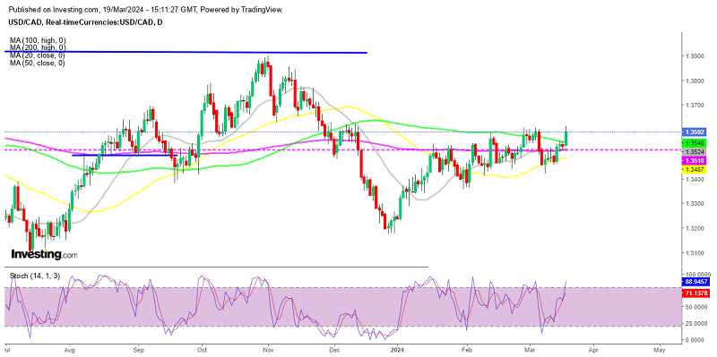 The CAD to USD rate has been bouncing between moving averages in a 1-cent range but today’s CPI (consumer price index) inflation report broke that range. Both the FED and the BOC are expected to start easing the monetary policy, so the game in USD/CAD now is which one will start cutting interest rates first.