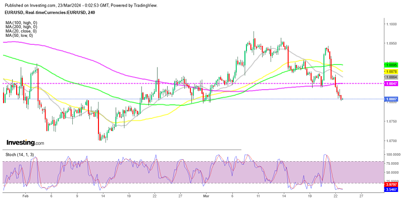 The EUR/USD currency pair closed at the day’s lows, experiencing a decline of 55 pips to 1.0805, marking the lowest level in March. This movement suggests heightened concerns and potential shifts in sentiment toward the Euro against the US dollar amidst evolving expectations surrounding central bank policies.