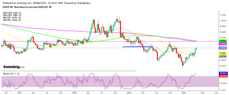 Looking at the weekly chart, USD/CHF has been on a declining trend since October 2022, with moving averages acting as resistance. The last occasion took place in October last year, with the 50 SMA (yellow) rejecting the price twice and acting as resistance after a retrace higher since July. The price fell below 0.84 by December this year as markets were expecting the FED to embark on a rate cut hiatus this year.
