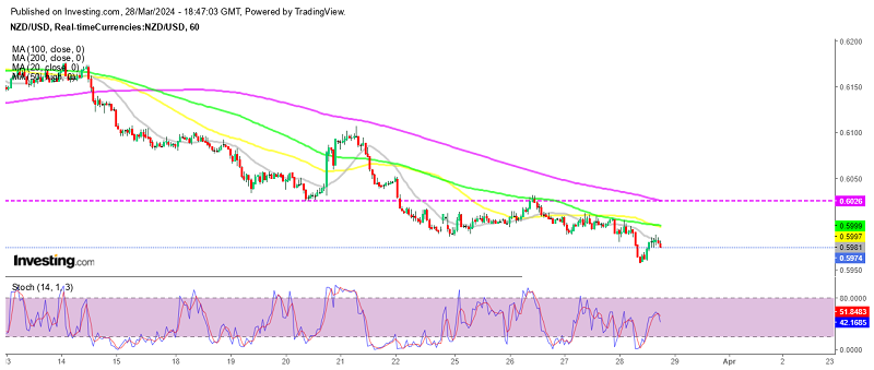 NZD/USD has lost around 2 cents since the middle of March, which is a steep decline, as markets now expect a less dovish FED, sending the USD higher. Moving averages have been providing resistance and after the break of the support zone at 0.60 today, we decided to open a sell forex signal below this level during this retrace higher, which now seems complete.