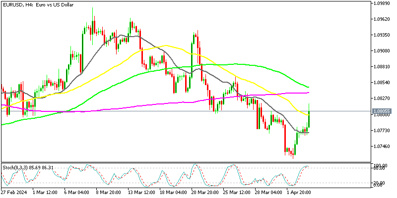 EUR/USD has been going through a steep bearish since early March, which is shown by the 50 SMA acting as resistance, pushing the price below 1.08 last week. But today we had the CPI inflation numbers from the Eurozone which slowed more than expected, however the Euro has been holding steady and it even jumped 40 pips higher now after the US SUm services which came weaker than expected.