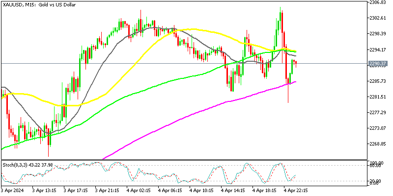 The Gold price reached a new record high today at $2,305 with the volatility being alright. But toward the US close, we’re witnessing some volatility on news that there might be some retaliation by Iran on Israeli embassies, which sent XAU $25 down to $2,280 before starting to reverse back up.