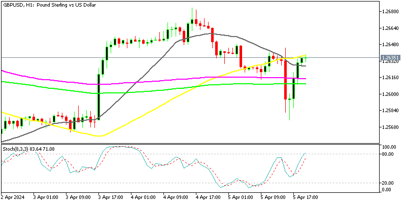 With no major fundamental drivers from the United Kingdom (UK), the GBP/USD remained largely sensitive to movements in the US Dollar. GBP/USD experienced significant volatility throughout the week, which also continued today. This forex pair initially broke below the moving averages falling to 1.2570s. However, GBP/USD later rebounded to climb just below the 50 SMA (yellow). This fluctuation in price was primarily influenced by market speculations regarding a potential hawkish policy reversal by the US Federal Reserve (Fed) and postponing the June rate cut after such strong numbers.