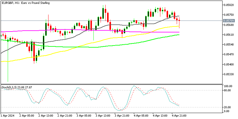 EUR/GBP has turned bullish this week as the Eurozone and German economy and particularly services give positive signals. This sector has been in recession since August last year. So, this is a positive development for the Euro, which is seeing some renewed demand, despite the ECB having already confirmed a June rate cut.