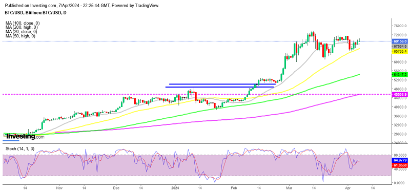 Last week the 50 SMA (yellow) caught up with the price and sent BTC higher above $70,000 again, helping BTC/USD keep the bullish trend. So, short sellers should exercise caution, as placing stops above the record high could contribute to upward momentum and trigger weak stops. However, trading cryptocurrency carries inherent risks, and individuals should be mindful of these risks when participating in the market.