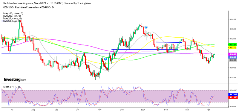 One of the primary drivers behind the bearish trend since the start of the year is the market’s perception of a less dovish stance from the Federal Reserve. As expectations for a rate cut by the Fed in June fall, investors have become more bullish on the US dollar, resulting in its appreciation against the New Zealand dollar. However, the USD is going through a period of retreat, which has sent NZD/USD above 0.60 but the 200 SMA (purple) is acting as resistance. Last night the business confidence showed a massive dive in Q1, which is not a good thing and will be another drag on the Kiwi trying to break above the 200 daily SMA.