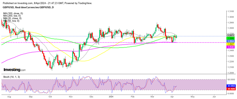 GBP/USD found support at the 200 SMA 1.2665 after the downtrend in March, and it bounced off this key moving average on the 4-hour chart. The 100 simple moving average (green) at 1.2670 was broken, but the 20 SMA (gray) at 1.2683 on the 4-hour chart held and rejected the price. On Friday, we saw a dip after the US Non-Farm Employment NFP but the price reversed back up pretty fast, and the daily candlestick closed as a hammer, with a long wick at the bottom, which suggests that the demand for the Pound was strong.