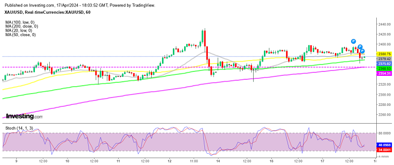 GOLD retreated lower to $2,362.93 this morning, representing a slight loss of around 0.35%. but moving averages held as support and from a technical standpoint, the precious metal remains pretty bullish. The 100 SMA (green) held as support on the H1 chart, and after forming a doji which is a bullish reversing signal after the retreat, the price is starting to bounce higher now.