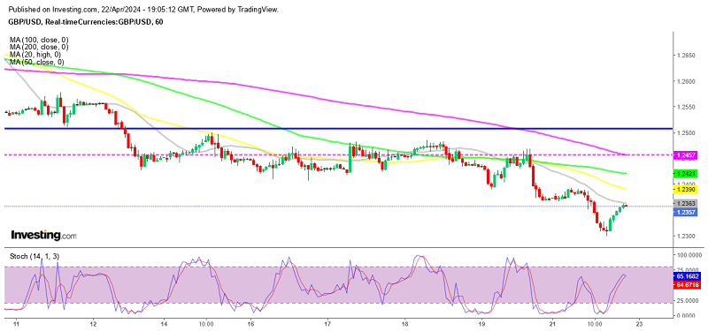 The trouble for GBP/USD started earlier this month when the USD started to regain momentum, leading to a sharp decline below the 1.2500 level in GBP/USD. Despite a brief consolidation period below this level, sellers came back the selling momentum resumed last Friday sending it below 1.24 where it closed last week. Today the selling momentum continued, resulting in a 0.4% decline to 1.2300, exactly to the pip.