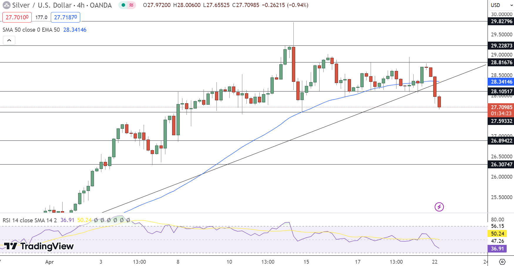Silver prices commenced the trading week on a decline, dropping to an intraday low of $27.78 per ounce. The decline in silver can primarily