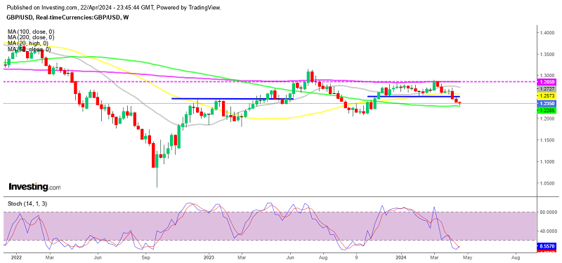 The pound has become the most bearish among major currencies as a result. The downward momentum for GBP/USD started earlier this month when the USD regained strength, leading to a significant drop below the key psychological level of 1.2500. Despite a brief period of stability below this level, selling pressure resumed, driving the pair below 1.24 and closing the week at that level. Yesterday, the selling pressure persisted, resulting in a decline to 1.2299. From a technical perspective, the 100-weekly SMA at 1.23 provides some support and led to a brief rally yesterday during the US session. The next significant support level is around the October low of 1.2000-1.2050.