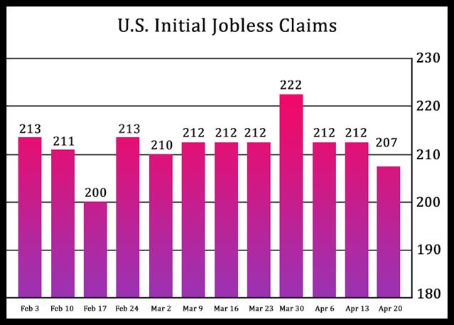 The report said initial jobless claims fell to 207,000, a decrease of 5,000 from the previous week’s unrevised level of 212,000. The dip surprised economists, who had expected jobless claims to inch up to 214,000.