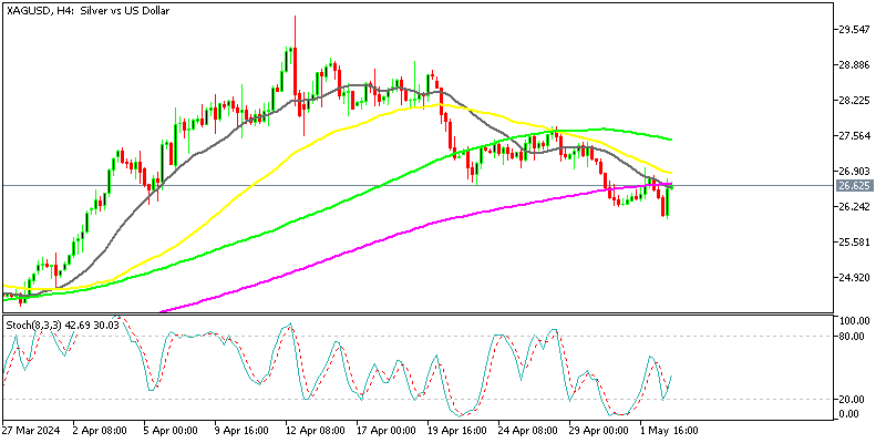 During the first half of this month, silver (XAG) experienced significant positive momentum, with buyers pushing the price above $29.79 but the reversal eventually happened. The 20-period Simple Moving Average (SMA) on the daily chart was providing support, showing the strength of the uptrend, but all MAs have been broken now and are acting as resistance indicators.