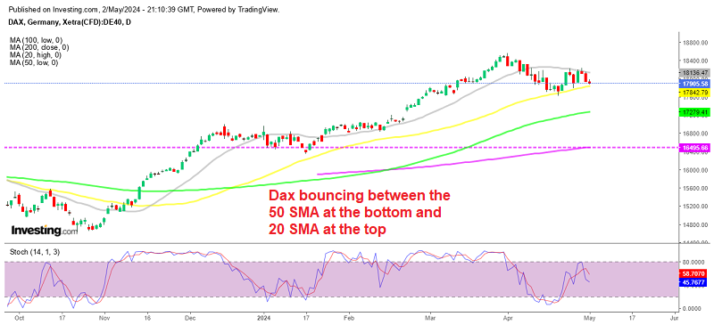 The Dax index has been rallying since October 2023, but is in a consolidation mode now. The price retreated lower during the first half of April, but has been stuck between two moving averages in the last two weeks, bouncing between the 50 SMA (yellow) at the bottom and the 20 SMA (gray) at the top.