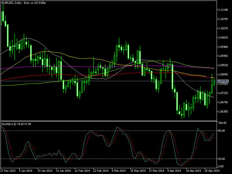 EUR/USD has made significant gains since mid-April, but the gains have slowed after meeting MAs around 1.07 which is a resistance zone.