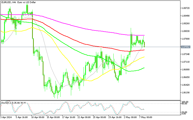 EUR/USD has seen significant gains since mid-April, but its upward momentum has stalled upon reaching resistance zones around the 1.08 level, where the 200 moving averages (purple) is located. The pair surged above 1.08 on Friday after the soft NFP figures, but faced rejection at the 100-day simple moving average (SMA) several times, subsequently falling back below 1.0.8 again where we decided to open a sell EUR/USD signal last night.