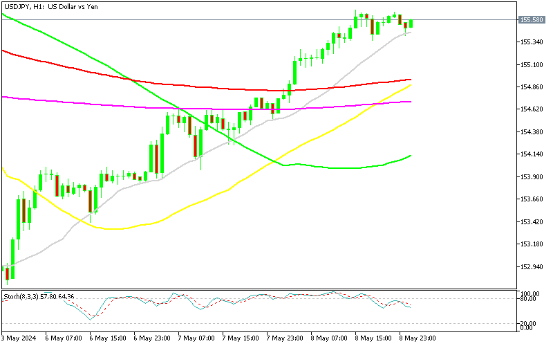 There’s been a gradual climb in the USD/JPY exchange rate, surpassing 155 recently, suggesting a trend of the US dollar strengthening against the Japanese yen. Regarding economic data from Japan, the Average Cash Earnings were reported, with expectations of a rise to 1.5% in March. Yesterday the price moved above 155 and we closed our buy USD/JPY signal in profit.
