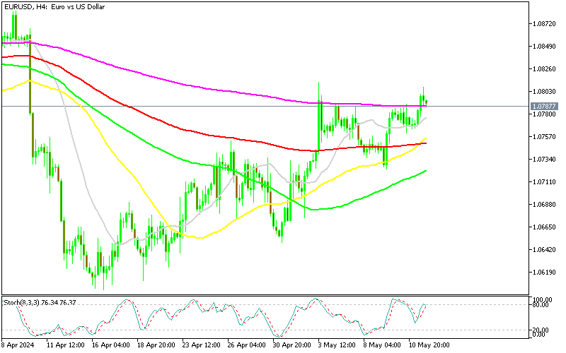 EURUSD continues to find resistance around the 1.08 level, having peaked just above earlier today, but reversed back down pretty fast.