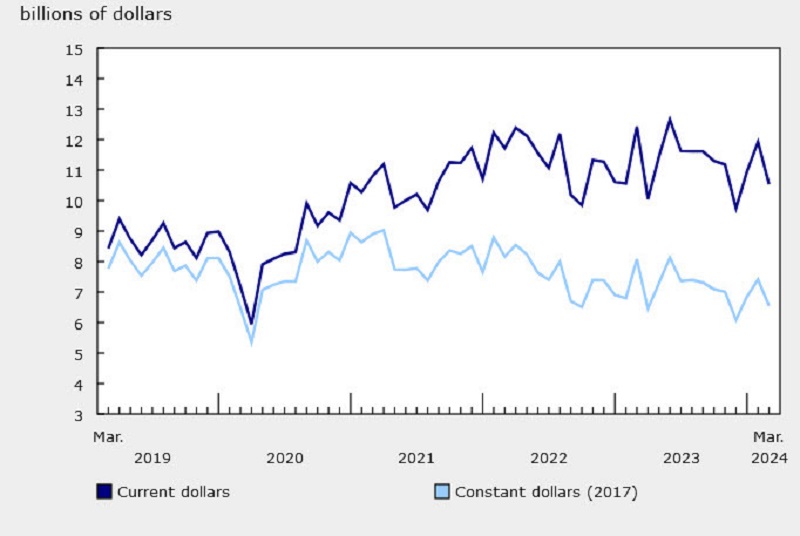The non-residential component saw permits decline by 16.7% to $4.0 billion, while the residential sector experienced an 8.3% drop to $6.5 billion. This decline follows two months of consecutive gains, with the overall gain for Q1 amounting to +3.7% from Q4 2023.