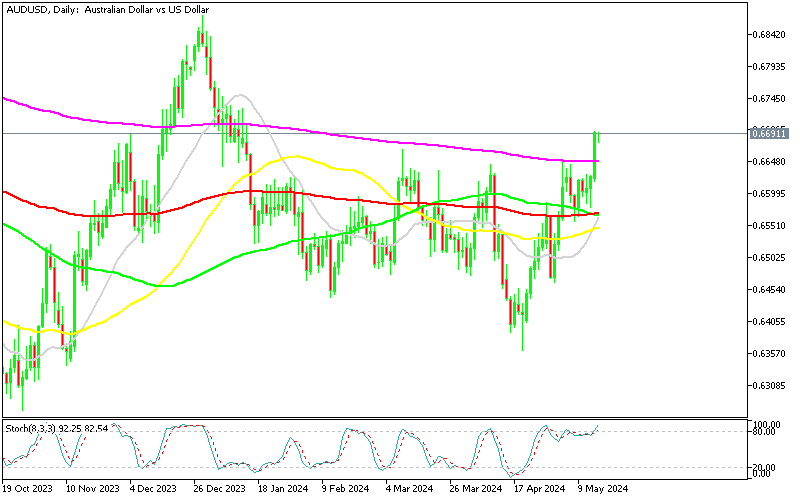 The Australian dollar saw a notable uptick of about 1% yesterday, as it surged around 70 cents, closing the day just below 0.67, influenced by a broad surge in risk appetite among investors coupled with a decline in the US dollar. After AUD/USD stabilized above 0.65 during May, yesterday movement which was driven primarily by weakness in the US dollar sent the price above the 200 SMA.
