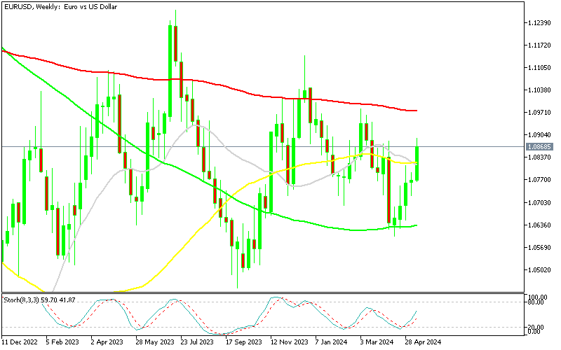 The EUR to USD rate has been bullish for 5 weeks, with EURUSD gaining almost 3 cents since this forex pair bottomed out at 1.06 in April. FED members are not giving any signs of rate cuts yet, while the ECB has all but announced a June rate cuts, with the US economy being in a better shape, but the Euro has been taking advantage of the USD nonetheless. However, looking at the weekly chart, EUR/USD has been trading in a range for around 18 months, which shows a lack of direction and certainty.