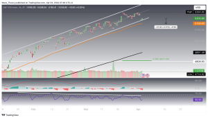 Navigating within an upward channel, the Nasdaq Composite (IXIC) is currently testing its mettle against the channel support at the pivotal 50-4H EMA. A successful defense of this level could propel the index towards a formidable resistance zone stretching from 15,450 to 16,539.
