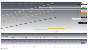 Current indicators accentuate the bears’ growing influence, highlighted by a developing bearish divergence and a worrying shift in the MACD histogram, paired with a bearish crossover in the MACD lines within the 4-hour chart. This confluence of signals suggests that caution is warranted, with a closer eye on support levels for potential breaches indicating a deeper correction.