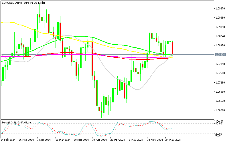 Yesterday the EUR/USD pair achieved a new weekly high of 1.0889, but it pulled back down and closed the day with a doji candlestick. The upside was driven by a weakening US dollar (USD) and increasing uncertainty about the pace at which the European Central Bank (ECB) will reduce key interest rates following its June meeting, since a 25 bps cut in June is a done deal.