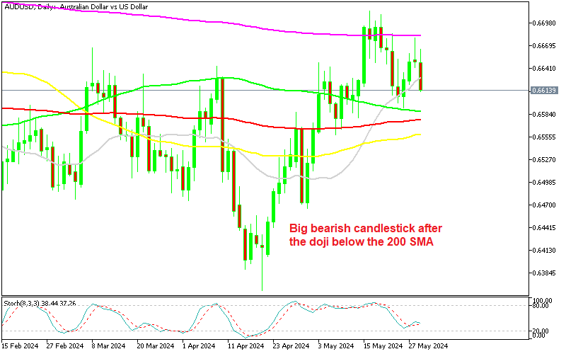 AUD/USD Chart Daily – Forming A Bearish Reversing Patter at the 200 SMA