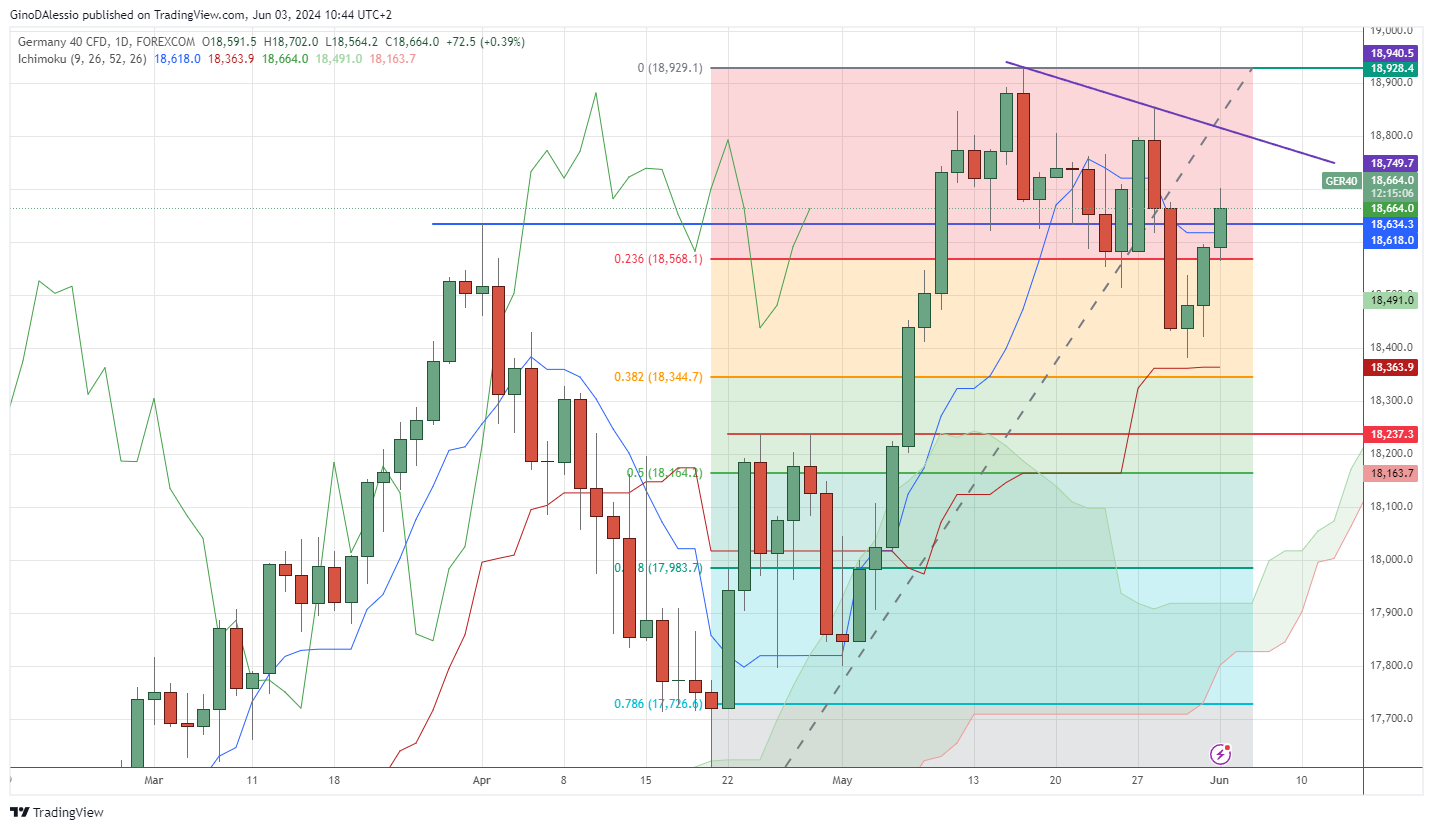 The day chart below for the DAX shows a bullish long-term trend undergoing a correction. The all-time high on May 16, of 18,928 led to a retracement of 2.9% at 18,381. From here the market has attempted to rally again, but for the bullish trend to continue we need to see the market close above 18,928.