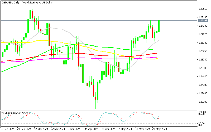 The GBP/USD rate has been rising for the past two months, demonstrating the British pound’s strength against the US dollar. However, last week, the pair hit severe resistance above 1.28, forcing the price to fall below 1.27. Despite this fall, the GBP/USD pair regained support at the 20-day Simple Moving Average (SMA), recovered, and reclaimed the 1.28 level yesterday.