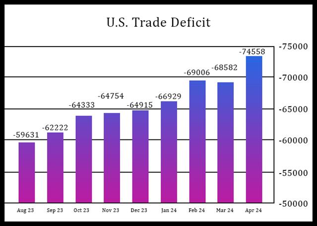 While narrower than expected, the trade deficit in April marked the largest since the gap reached $75.3 billion in October 2022.