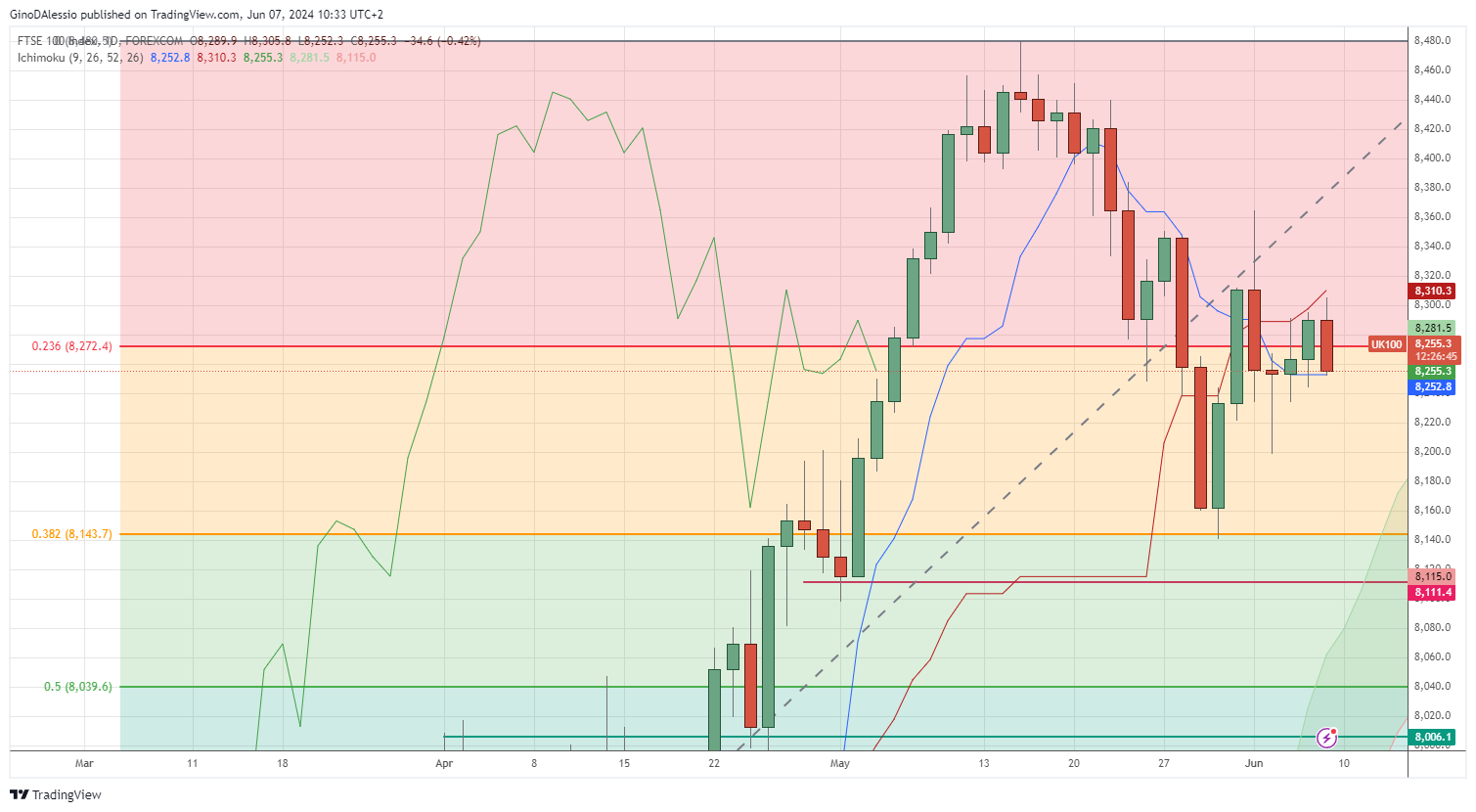 The day chart below for the FTSE shows a bullish trend undergoing a correction. The high on May 15, of 8,480 led to a retracement back down to the 0.382 Fibonacci retracement at 8,143 (yellow line).