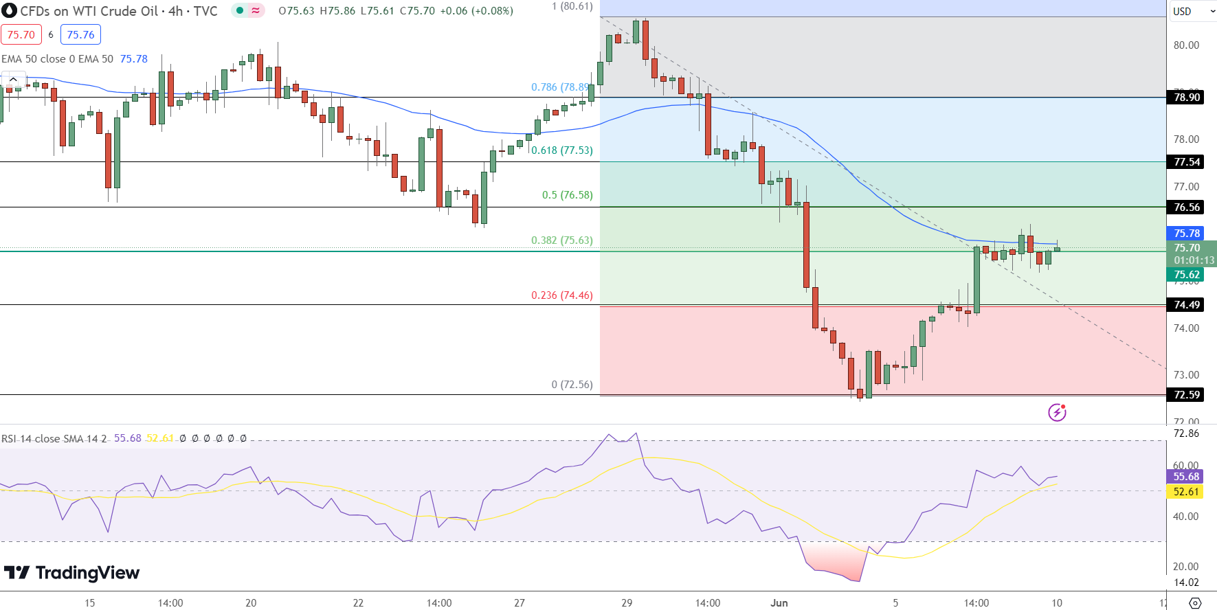 WTI Crude Oil is currently priced at $75.76, marking a modest increase of 0.08% in today’s trading session. The oil market is observing critical technical levels on the 4-hour chart that could dictate short-term price movements.