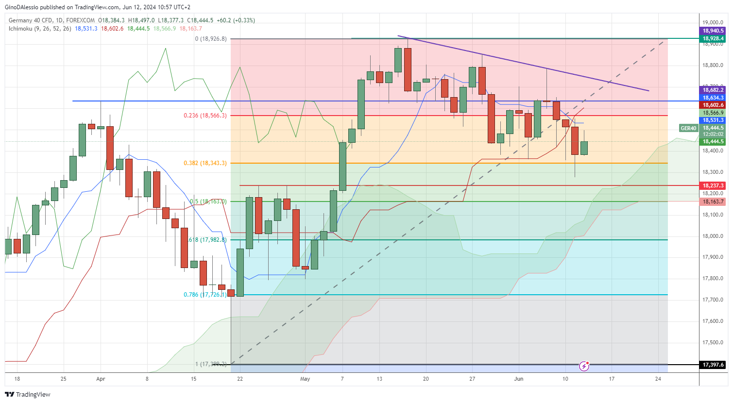 The day chart for the DAX shows a retracement from the all-time high of 18,928 has found support close to the 0.382 Fibonacci level of 18,343. Today’s candle is in line with that level, and we have the next resistance at the 0.236 Fibo level of 18,566.