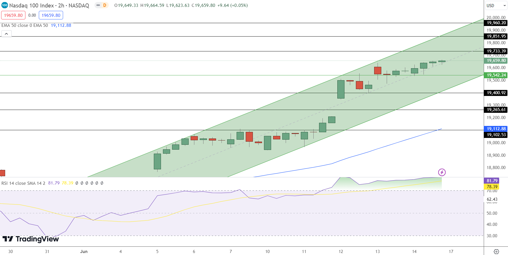 The Nasdaq 100 index closed at $19,659.80 on June 17, showcasing a 0.05% increase, and maintaining a bullish trend within an ascending