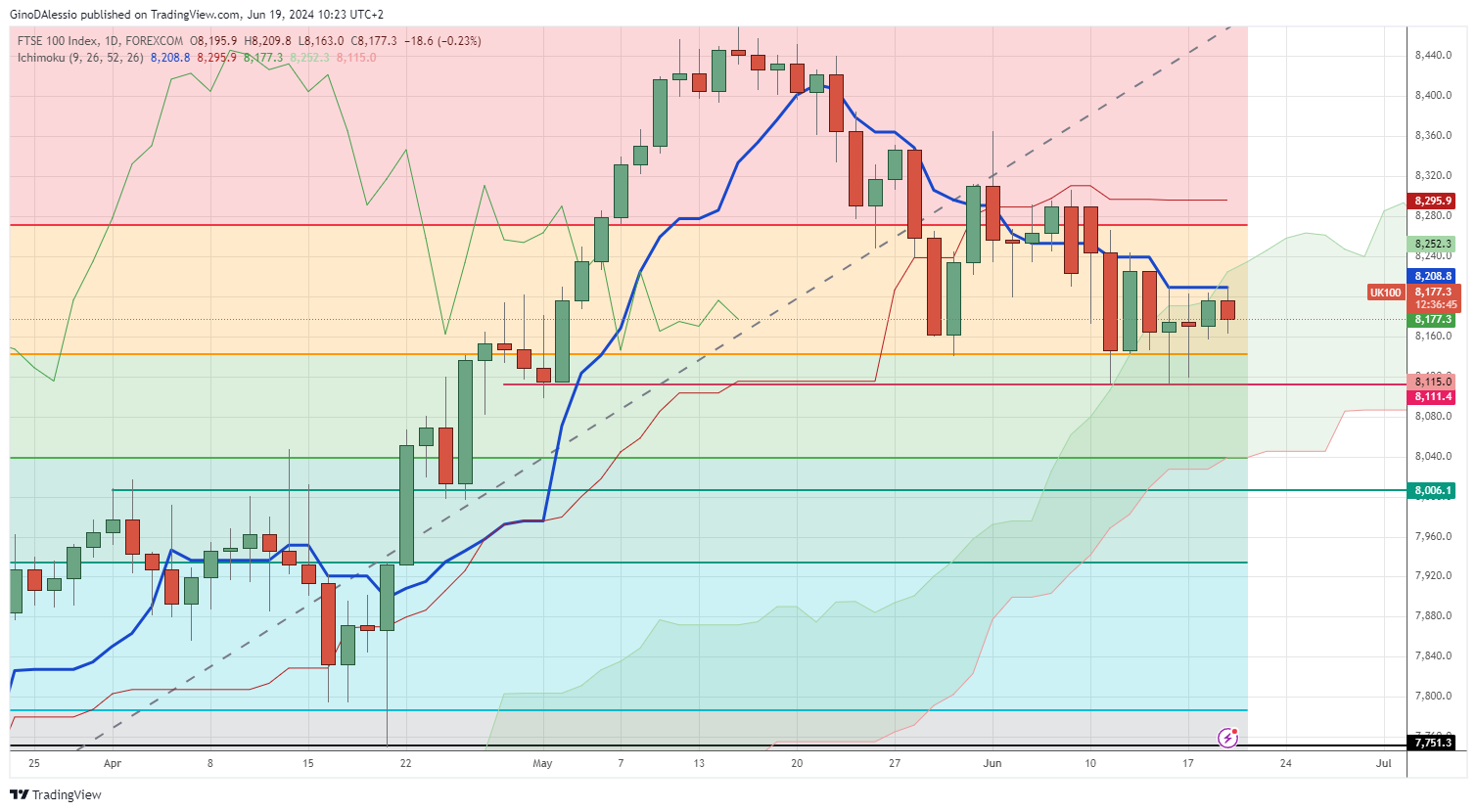 The day chart below for the FTSE shows a market that has been in a sideways trend over the past 4 sessions. With the high of the range topped by the Tenkan Sen (blue line) of the Ichimoku system.