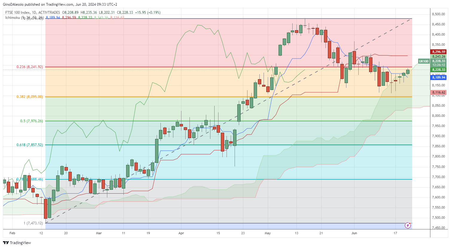 The day chart below for the FTSE shows a bullish trend with the market above the Ichimoku cloud. The past 5 candles have found support on the cloud after a correction from the all-time high of 8,480.