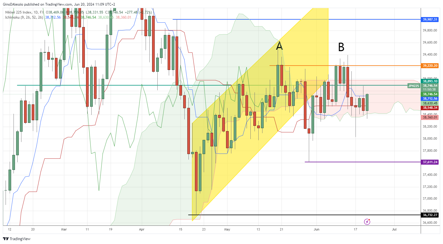 The downside is supported by the bottom of the clous at 38,400 area. Further support will be found at the low of the June 17 candle at 38,040 and further down at a previous low of 37,611.