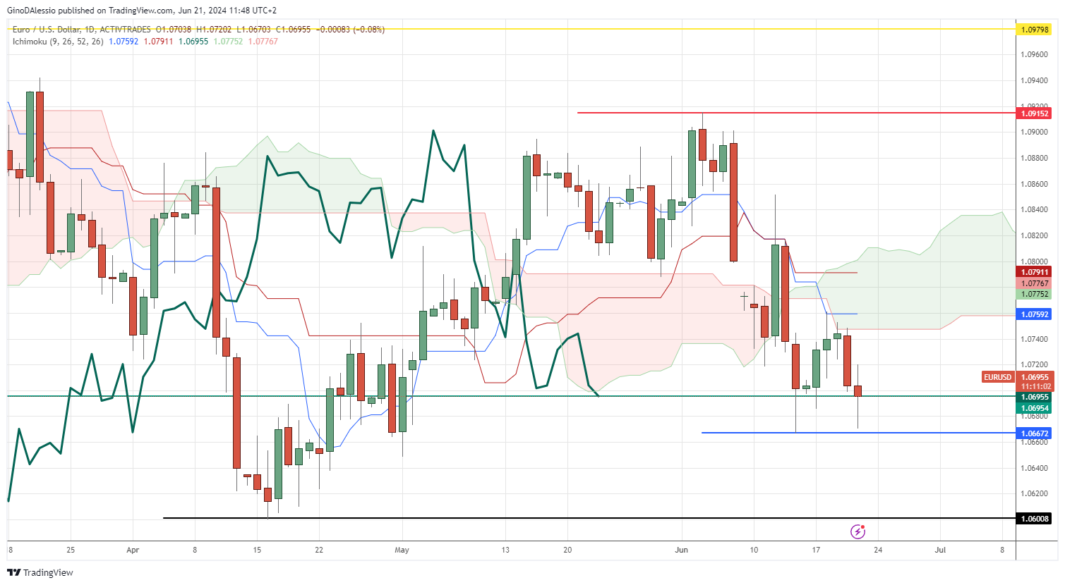 The last element is the lagging line (dark green), which also needs to close below the Ichimoku cloud to complete the signal. A close below the support of 1.0692 (light green line) would give further indications of a bearish trend.