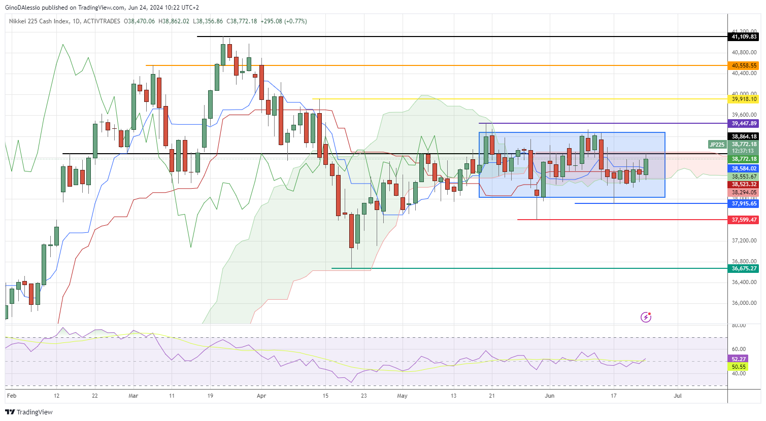 The cloud, also known as no-man’s land, is an aera of uncertainty, which is also evident from the sideways trend. A breakout above or below the cloud should give rise to the next trend with resistance at 39,447 (purple line), corresponding to a previous high.
