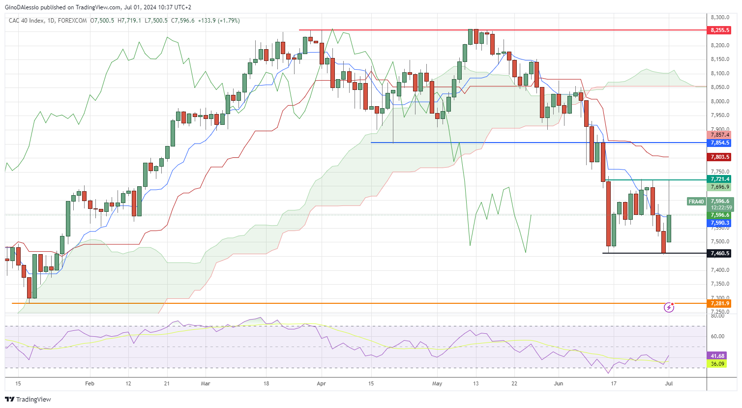 The day chart below for the CAC shows a bearish trend with the market below the Ichimoku could following a series of lower lows and highs. The previous low from June 14 seems to have created a base after a second touch on Friday.