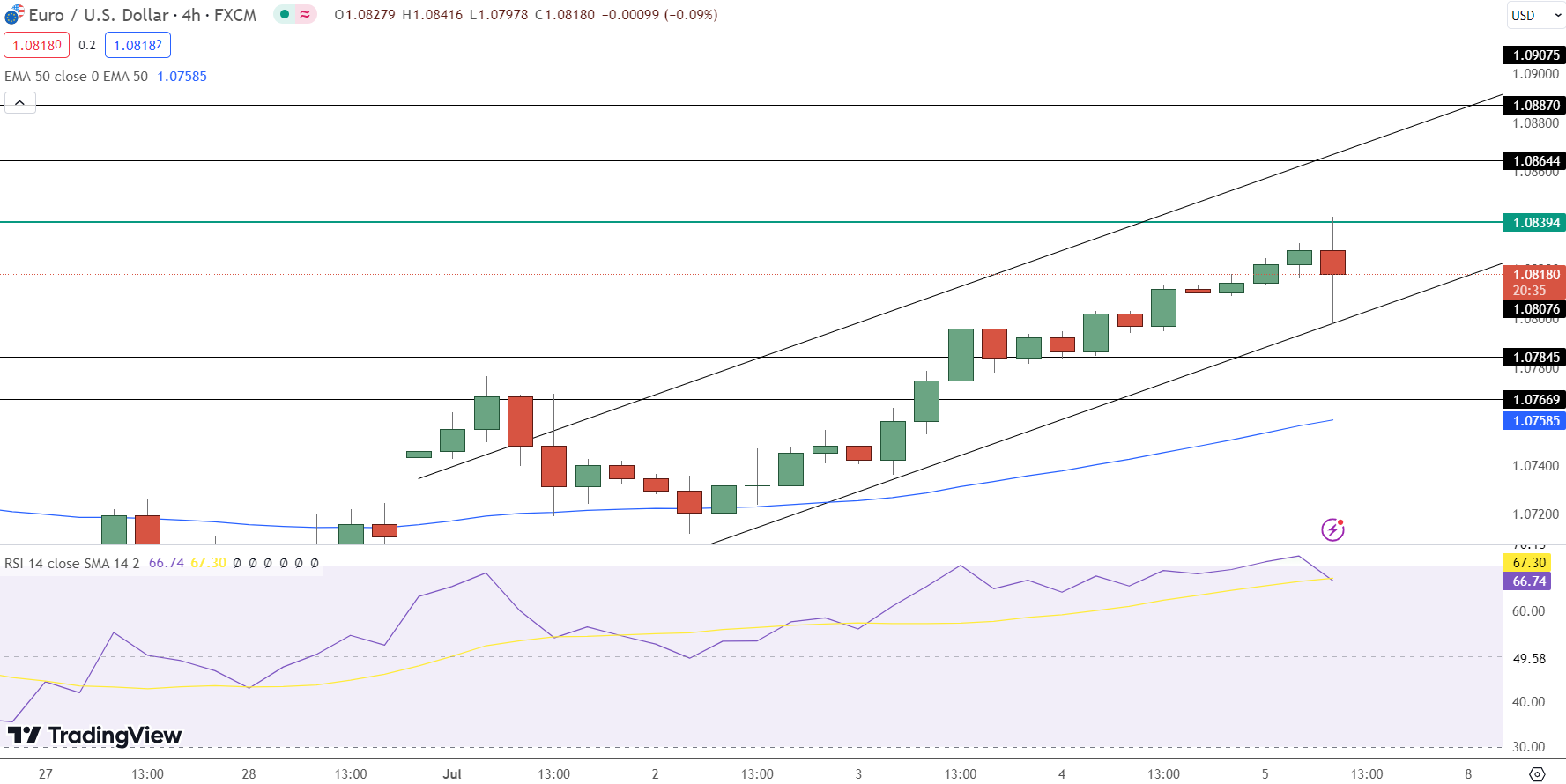 The 50-day Exponential Moving Average (EMA) at $1.0769 continues to act as dynamic support, underpinning the bullish outlook for the EUR/USD as long as prices remain above this level.