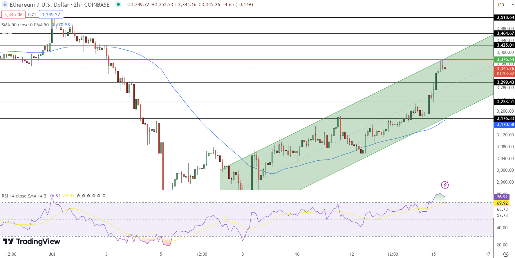 Despite trading below the 100-day SMA and the bearish trendline on the daily chart, Ethereum is making strides towards the $3,360 resistance mark. This progress is further evidenced by the daily RSI, which has exited the oversold zone, approaching a neutral 50%, suggesting sustained bullish conditions.
