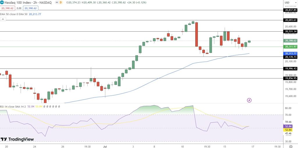 As of July 17, the Nasdaq 100 Index is trading at $20,398.62 on a 2-hour chart timeframe. The pivot point is at $20,311.97.