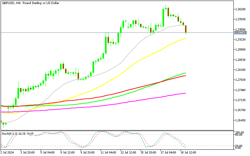 The pair has been rising since bottoming on July 2, according to the H4 chart. From lows of 1.26 to this week’s high of 1.3044, the pair has gained more than 4 cents in just 11 days, which is a notable change in a short amount of time. But, the rising 20 SMA, which has served as support twice since July 2023, was broken yesterday in the US session.